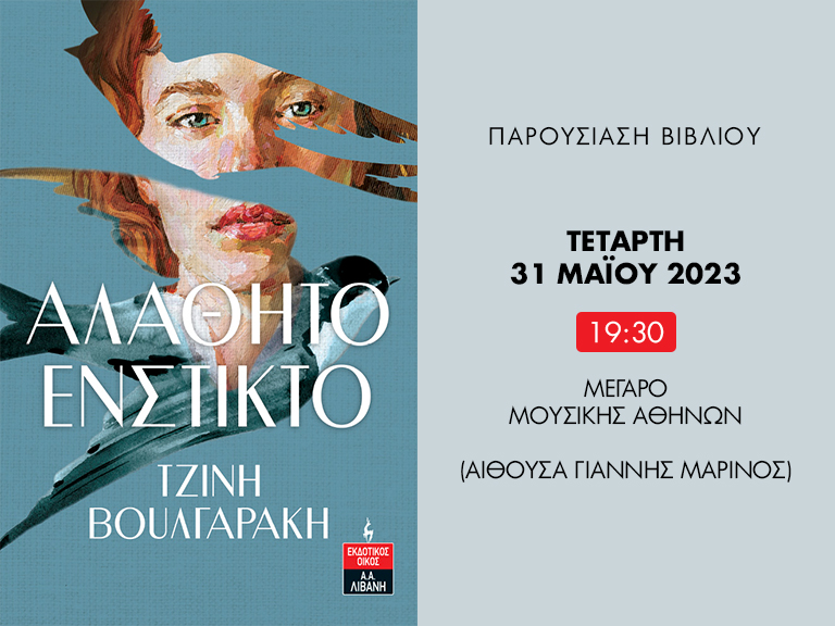 Διαβάστε ΠερισσότεραΟ Εκδοτικός Οργανισμός Λιβάνη έχει τη χαρά να σας προσκαλέσει στην παρουσίαση του βιβλίου της Τζίνης Βουλγαράκη ΑΛΑΘΗΤΟ ΕΝΣΤΙΚΤΟ που θα πραγματοποιηθεί την Τετάρτη 31 Μαΐου 2023, στις 19:30, στην Αίθουσα Γιάννης Μαρίνος (πρώην Πολυχώρος)...