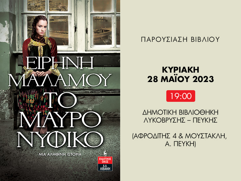 Διαβάστε ΠερισσότεραΗ ΔΗΜΟΤΙΚΗ ΒΙΒΛΙΟΘΗΚΗ ΛΥΚΟΒΡΥΣΗΣ – ΠΕΥΚΗΣ και ο Εκδοτικός Οργανισµός Λιβάνη σας προσκαλούν στην παρουσίαση του βιβλίου της Ειρήνης Μαλάµου ΤΟ ΜΑΥΡΟ ΝΥΦΙΚΟ την Κυριακή 28 Μαΐου 2023, στις 19:00, στη ΔΗΜΟΤΙΚΗ ΒΙΒΛΙΟΘΗΚΗ ΛΥΚΟΒΡΥΣΗΣ –...
