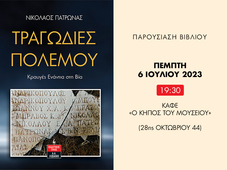 Διαβάστε ΠερισσότεραΟ συγγραφέας ΝΙΚΟΛΑΟΣ ΠΑΤΡΩΝΑΣ και οι Εκδόσεις Λιβάνη σας προσκαλούν στην παρουσίαση του βιβλίου ΤΡΑΓΩΔΙΕΣ ΠΟΛΕΜΟΥ την Πέμπτη 6 Ιουλίου 2023, στις 19:30, στο καφέ «Ο Κήπος του Μουσείου» (28ης Οκτωβρίου 44). Στοιχεία επικοινωνίας: Εκδοτικός...